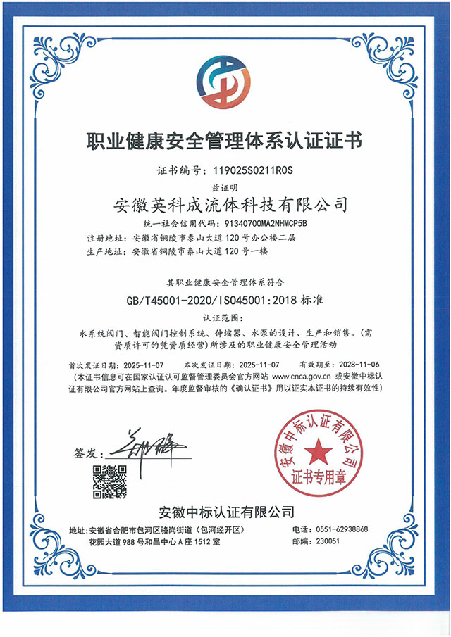 職業(yè)健康安全管理體系認證證書